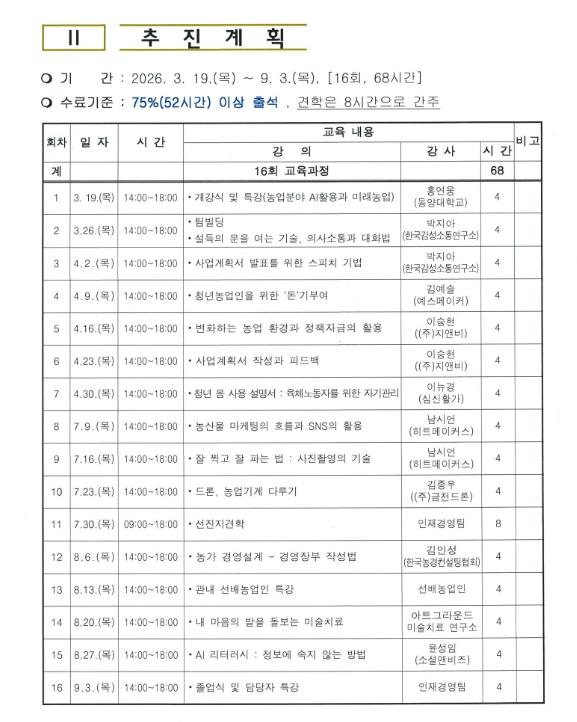 이번 청년농업인과정은 3월 19일 개강식을 시작으로 9월 3일까지 총 16회에 걸쳐 운영될예정이며 특히 변화하는 농업 환경에 발맞추어 청년농업인들이 현장에서 필요로 하는실질적인 지식과 기술을 전달하고 농촌의 안정적인 정착을 도모할 수 있는 다양한프로그램이 마련되어 기대를 모으고 있다.