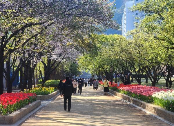 현재 공원 산책로와 화단의 정성껏 가꾼 튤립들이 형형색색 꽃망울을 터뜨리며 이국적인 봄 풍경을 연출하고 있다.
