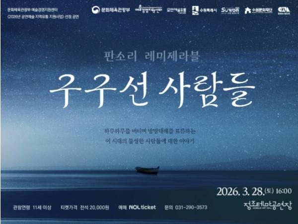 수원문화재단은 정조테마공연장에서 오는 28일 오후 4시, 문화체육관광부와 예술경영지원센터의 ‘2026 공연예술 지역유통 지원사업’ 선정작인 ‘판소리 레미제라블 '구구선 사람들'’을 선보인다.