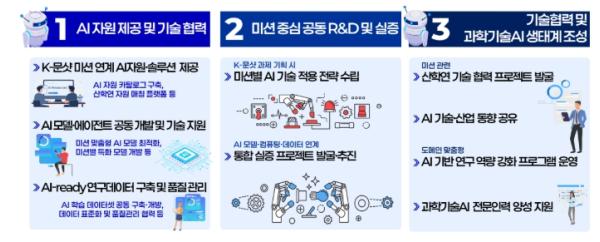 기업 동반관계(파트너십)는 ➊ 인공지능 모델, ➋ 컴퓨팅·연결망(네트워크), ➌ 데이터 등 3개 분과로 운영되며, 인공지능 자원 제공 및 기술 협력, 공동 연구개발 및 실증, 인공지능 기반 과학기술 생태계 조성 등을 추진한다. 또한, 협력기업을 대상으로 연구데이터·그래픽 처리 장치(GPU) 등 기반 시설(인프라)과 후속 사업화 지원 등 다양한 유인책(인센티브)을 제공할 계획이다.